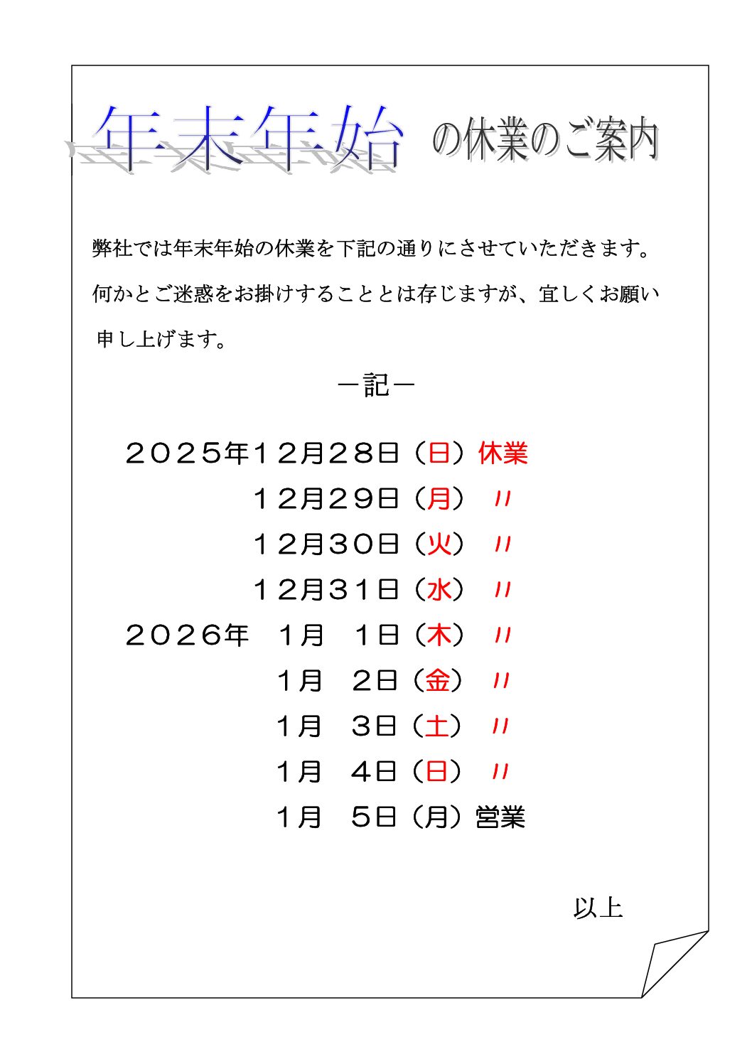 2025年12月28日(日)~2026年1月5日(日)まで8日間を 休業とさせていただきます。 尚、休業前後12月27日(土)、1月5日(月)の営業時間は 通常通りとなります。 (営業時間)8:00~ […]